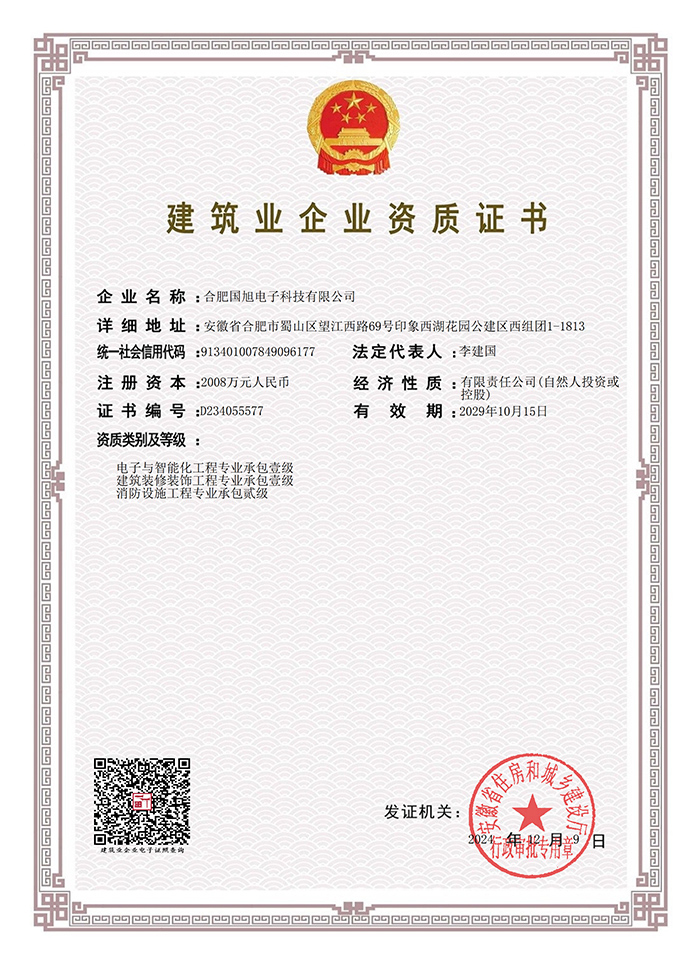 公司現(xiàn)已獲得承裝(修、試)電力設施許可證、電子與智能化工程專業(yè)承包壹級資質(zhì)、建筑裝修裝飾工程專業(yè)承包壹級資質(zhì)、消防設施工程專業(yè)承包貳級、安全技術防范行業(yè)壹級資質(zhì)、雷電防護裝置檢測資質(zhì)證乙級資質(zhì)、安全生產(chǎn)許可證、通過ISO9001:2015質(zhì)量管理體系認證、ISO14001:2015環(huán)境管理體系認證、OHSAS18001:2007職業(yè)健康安全管理體系認證等榮譽。我們還將進一步努力,爭取贏得更多的榮譽。